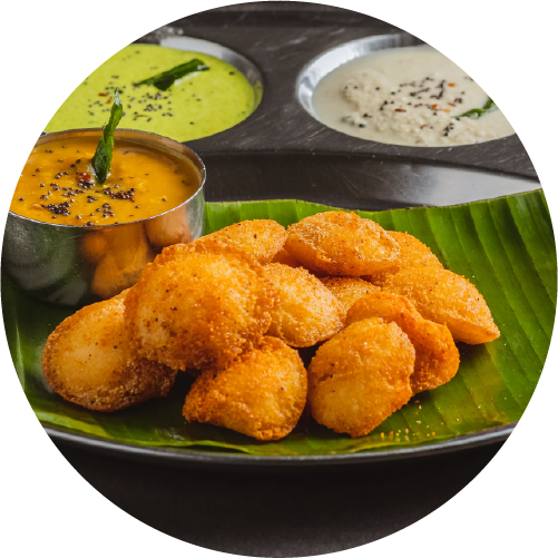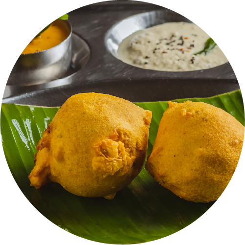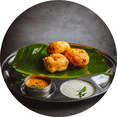 Crispy lentil doughnuts served with sambar and chutney.
