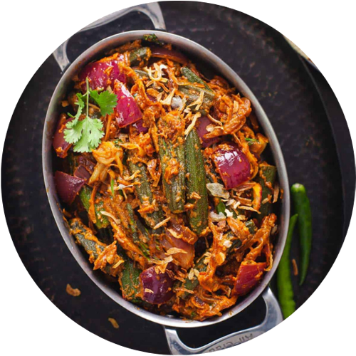 Crisp okra stir-fried with masala.