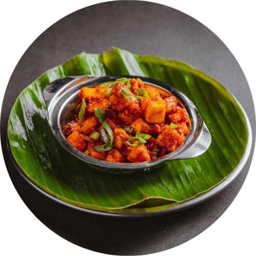 Paneer cubes in spicy chilli sauce.