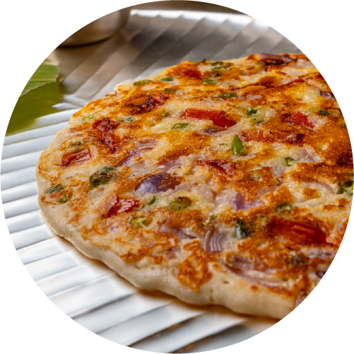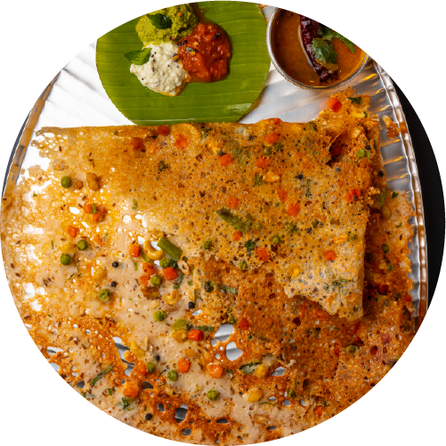 Crispy thick pancake dosa with vegetable toppings.