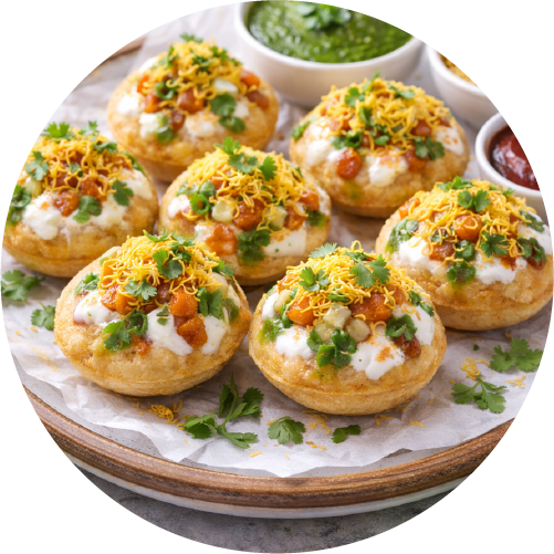 Hollow puris filled with curd, potato and chickpeas.