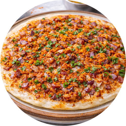 Crispy thick pancake dosa with onion and chilli topping.