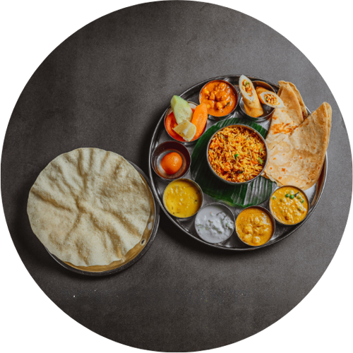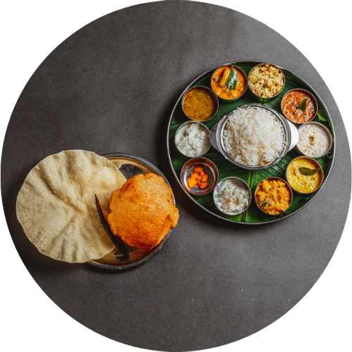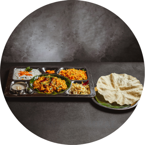 Rice, sambar, rasam, kootu, poriyal, vathakuzhambu, dhal, pickle, sweet, raita, yogurt, banana, papad, butter chilli and chapathi/poori (1 pc).