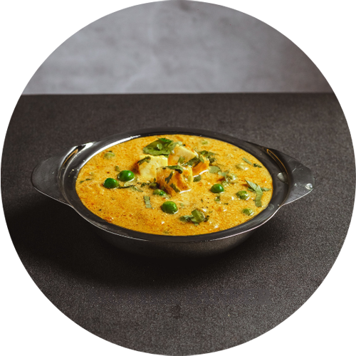 Paneer and peas cooked in yellow gravy.