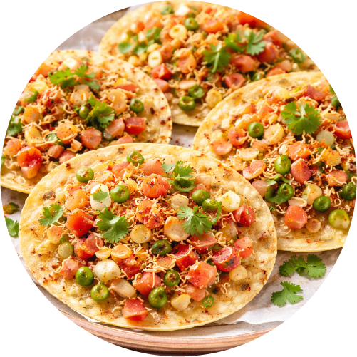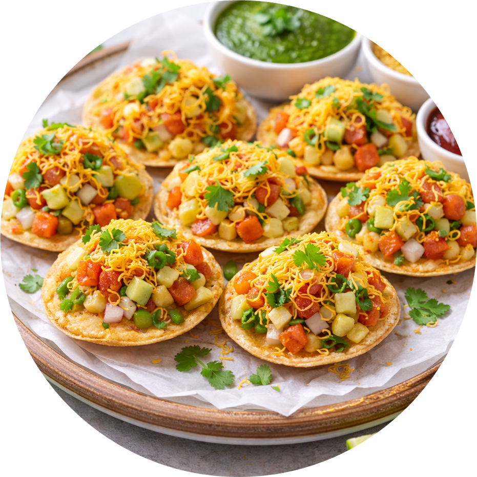 Crispy fried papad topped with spiced fresh condiments.