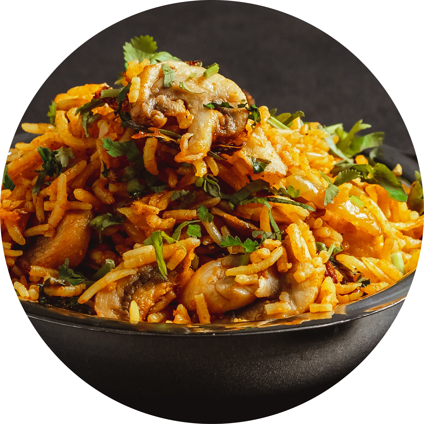 Spiced basmati layered with juicy mushrooms.
