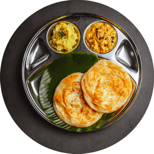 Layered flaky parottas served with two kormas.