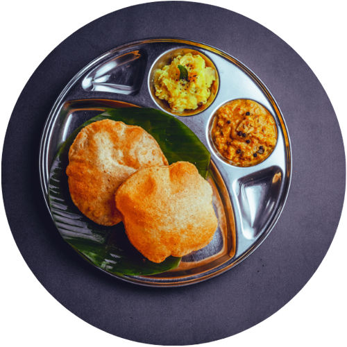 Deep fried pooris served with potato masala and coconut chutney.
