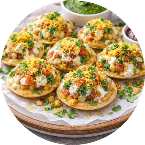 Crispy puris topped with sev, potatoes and chickpeas.