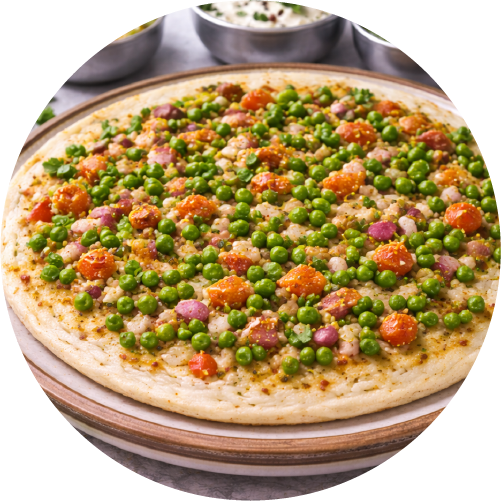Crispy thick pancake dosa with peas, chilli and tomato toppings.