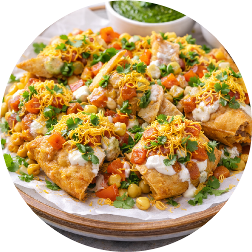 Crushed samosa served with yogurt, tamarind chutney and sev.
